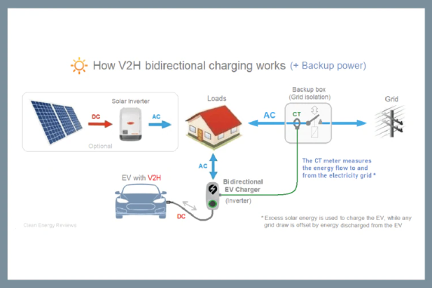 圖1:使用直流雙向充電器的“車輛到電網(wǎng)”(V2G)能量流動圖(圖片來源:Clean Energy Reviews)。