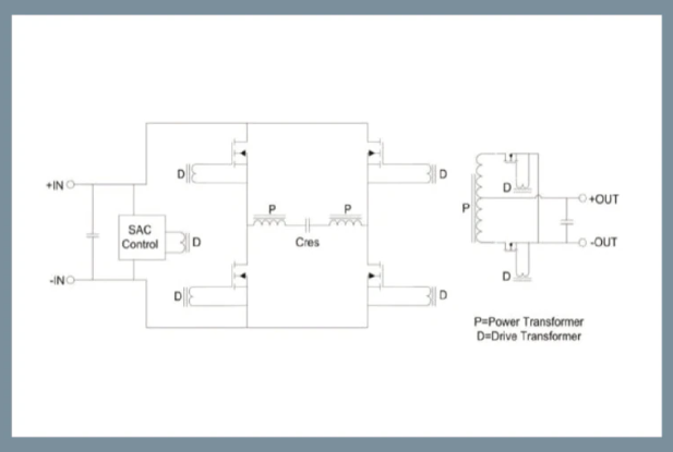 一側(cè)有一個開關(guān)橋(switching bridge),通常會被視為一個斬波DC母線的直流輸入,而另一側(cè)的布局基本相同,可以被稱為同步整流器。只要這兩條路徑與中心“儲能器”的諧振波形同步切換,整個器件就是對稱的,作用就像DC變壓器。