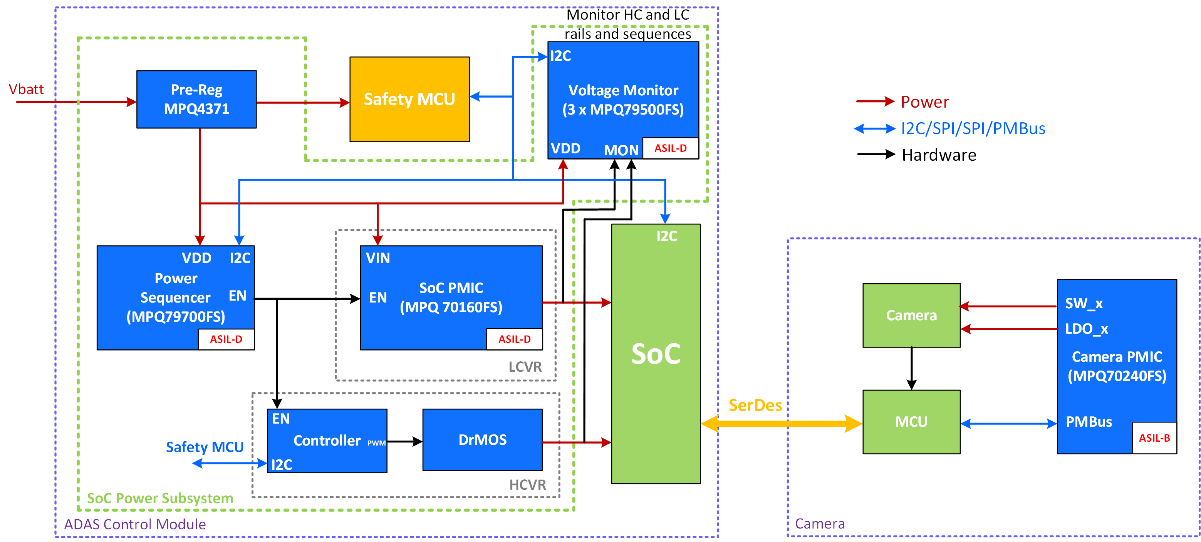 圖 7展示了一個位自動駕駛平臺計算中心供電的頂層架構(gòu)。該架構(gòu)為符合 ASIL-D 標(biāo)準(zhǔn)的智能自動駕駛平臺供電與監(jiān)控平臺。 整個架構(gòu)大體分為SoC供電模塊,攝像供電模塊兩部分。MPS提出的解決方案通過采用MPSafe開發(fā)流程,在保證功能安全的基礎(chǔ)上,同時能幫助用戶實現(xiàn)高效、快捷和成本可控。
