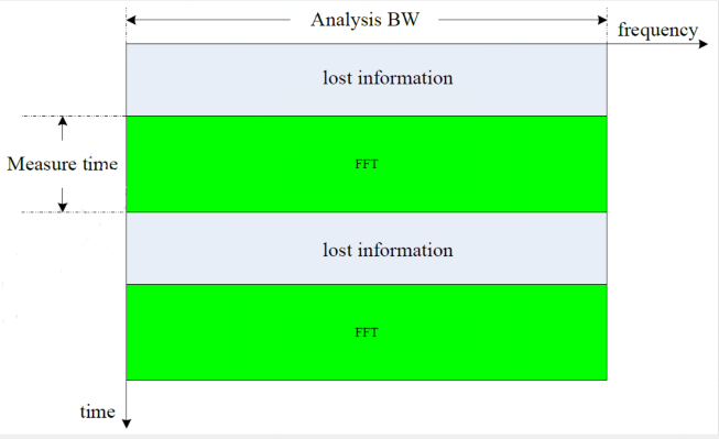 傳統(tǒng)掃描式頻譜分析儀還可以使用Swept FFT模式來處理信號。但是需要先采集一段信號并處理,處理完這段信號后再采集下一段信號,這種模式會存在死區(qū),也很難完整采集到瞬態(tài)信號。因此,傳統(tǒng)分析儀難以很好地獲取瞬態(tài)信號的頻域信息。