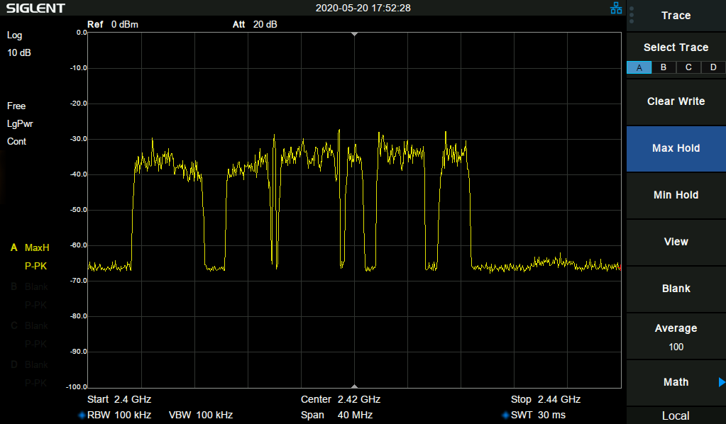 我們使用掃描式頻譜分析儀來分析瞬態(tài)信號(比如藍(lán)牙信號)。通過圖2可以看到每掃描一個Span得到的結(jié)果基本上都只有一個信號,但是測量的結(jié)果并不理想。頻譜儀正在掃描圖中紅色小點(diǎn)所在頻點(diǎn)上的信號,如果此時藍(lán)牙信號出現(xiàn)在其他頻點(diǎn),掃描式頻譜儀則無法掃描到該信號。為了捕捉完整的藍(lán)牙信號,我們可以嘗試使用Max Hold功能來記錄出現(xiàn)過的信號(如下圖3),但是Max Hold功能在使用一段時間以后,部分信號細(xì)節(jié)會逐漸被覆蓋掉,最后甚至看不清一個完整的瞬態(tài)信號。