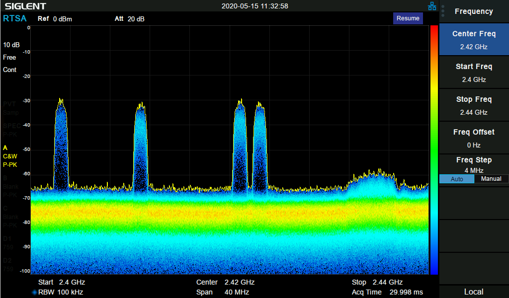 自從人們實(shí)現(xiàn)了無線通信以后,無線通訊技術(shù)開始迅猛發(fā)展,發(fā)展到今天,移動網(wǎng)絡(luò)、WiFi、藍(lán)牙、RFID等技術(shù)百花齊放,RF頻譜變得越發(fā)擁擠。有時候不同類型的RF信號會相互干擾。面對快速、隨機(jī)變化的信號,在需要觀察實(shí)時頻譜的場景中,傳統(tǒng)的掃描式頻譜分析儀在需要觀察實(shí)時頻譜的場景中已經(jīng)不能滿足實(shí)時性的需求。