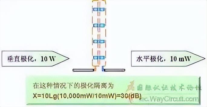 極化完全隔離:當(dāng)接收天線的極化方向與來波的極化方向完全正交時(shí),例如用水平極化的接收天線接收垂直極化的來波,或用右旋圓極化的接收天線接收左旋圓極化的來波時(shí),天線就完全接收不到來波的能量,這種情況下極化損失為最大,稱極化完全隔離。理想的極化完全隔離是沒有的。饋送到一種極化的天線中去的信號多少總會有那么一點(diǎn)點(diǎn)在另外一種極化的天線中出現(xiàn)。例如下圖所示的雙極化天線中,設(shè)輸入垂直極化天線的功率為10W,結(jié)果在水平極化天線的輸出端測得的輸出功率為10mW。