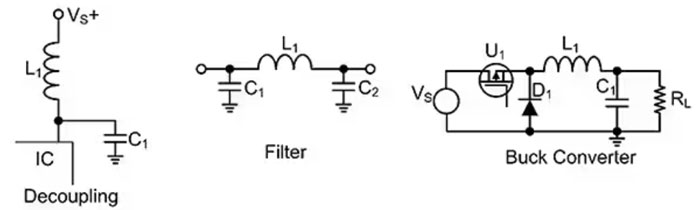 電源總線中的去耦集成電路,利用電感器的頻率可變阻抗結(jié)合電容器的互補(bǔ)阻抗特性,來衰減高頻信號和噪聲,從而使其與集成電路電源輸入相隔離。低 DCR 和高 SRF 是重要的電感器特性。