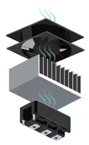 最有效的熱管理方法是將散熱器和強制通風相結(jié)合。IGBT 等半導(dǎo)體器件的內(nèi)部熱阻通常極低,而該器件與周圍空氣之間的熱阻則相對較高。安裝散熱器可大幅增加向環(huán)境空氣散熱的可用表面積,從而降低熱阻。此外,在散熱器上引導(dǎo)氣流可進一步提高其能效。鑒于器件空氣界面是系統(tǒng)中最重要的熱阻,因此將其最小化至關(guān)重要。這種直接方法的優(yōu)勢在于無源散熱器的可靠性和風扇技術(shù)的成熟性。