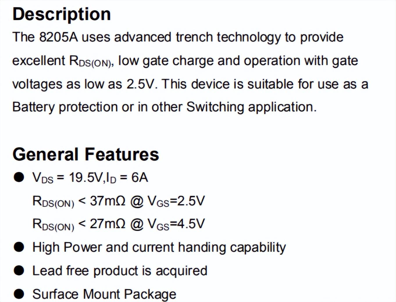 再接著瀏覽8205 MOS管的數(shù)據(jù)手冊,查看它的內(nèi)部導(dǎo)通電阻是小于37mΩ。